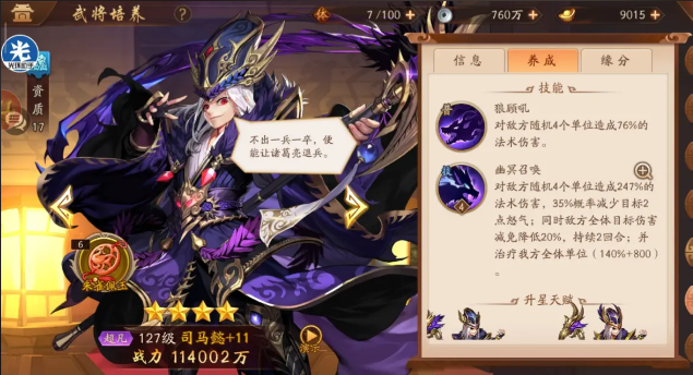 司马懿的十字伤害自带免伤效果,能快速削弱敌方前排与中排单位,贾诩的中毒伤害则弥补持续输出不足的问题。郭嘉作为辅助核心,其随机回怒和全体免伤20%的光环极大提升团队容错率。若资源有限,可暂缓培养乐进等天赋较弱的武将,集中资源强化主力橙将的星级与装备。