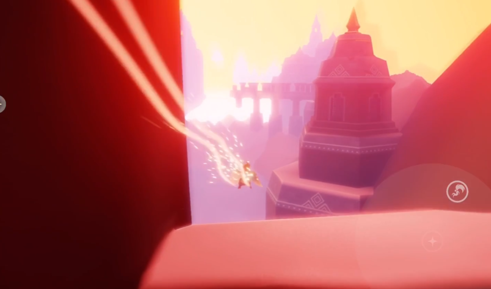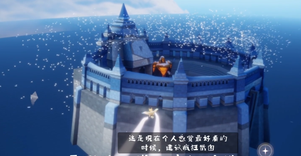 还有个更简单的办法是从暮土出发,先飞到霞谷终点大厅。到了大厅后把大门打开,然后飞到门顶上那个凸起的框框那里。在光圈上坐一下,这样就能确保看到的是白天版本的千鸟城。坐完光圈后往右边的窗户飞出去,一直往左前方飞就能看到千鸟城了。这个方法比较省事,而且路上还能蹭云补充能量,特别适合刚玩没多久的小伙伴。