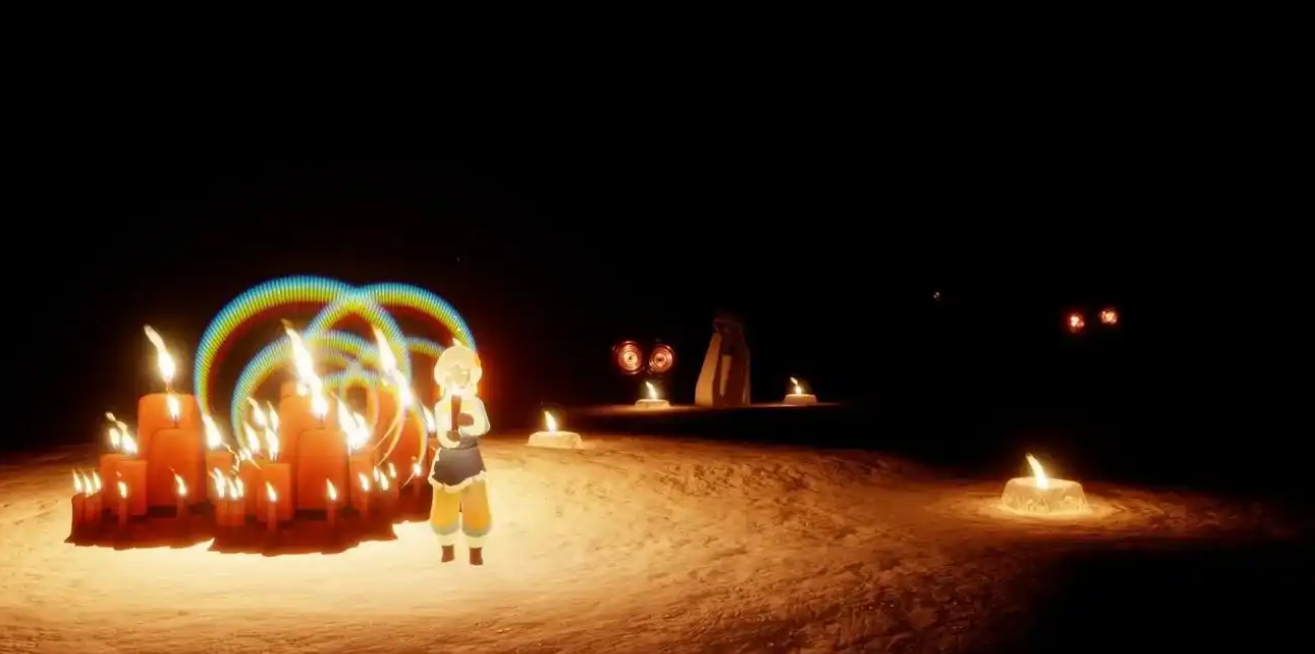 最后一关的路线稍微复杂一点,建议先沿着右边墙面的蜡烛走,点亮之后再靠左边前进。路上会遇到多列蜡烛,别着急,一步一步来。走到终点时会看到一个石像,跪拜它就能完成试炼。这时候咱们会获得一个光之翼,还能解锁特殊能力,以后火球怪撞到咱们反而会被烧掉。如果觉得一个人过太难,可以叫上好友一起,互相帮忙充能和提醒火球怪的位置,这样会轻松很多。
