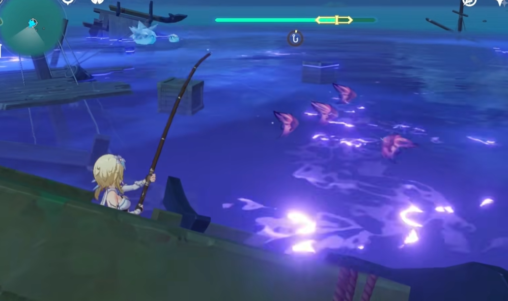 建议提前清理钓鱼点周围的敌人,避免干扰。携带足够的蠕虫假饵,并确保鱼竿选择鸣川鹈饲(可在稻妻钓鱼协会兑换),以提高钓鱼效率。调整游戏时间至夜晚后,站在沉船或小岛的安全位置抛竿,注意不要靠近水域边缘,否则可能因雷元素环境受伤。