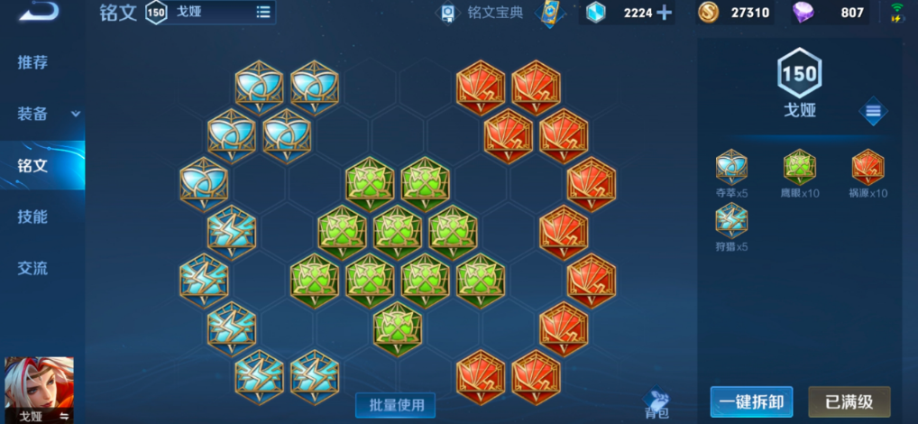 铭文方面推荐带祸源、狩猎和鹰眼,主打暴击和攻速。召唤师技能首选疾跑,增强机动性,方便风筝敌人。戈娅的技能连招比较简单,对线期可以用1技能接普攻消耗,团战时先用3技能远距离控场,再进场输出。
