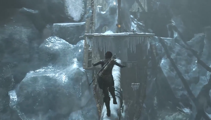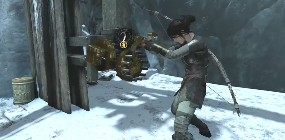 接下来回到甲板,沿着被砸开的冰壁往上爬,来到上层平台。这里有个手轮,摇动它会让另一侧的金属锅降下,记得一定要把它降到最低点。松开手轮后迅速从横杆走过去,趁着金属锅还没完全抬升时跳到上面,撞破左侧墙壁的冰层。