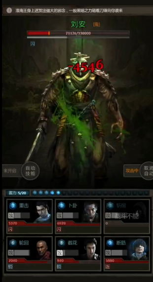 前四波小怪中,第一波需注意降速与回血机制,第二、三波以普攻攒豆为主,奶妈需持续治疗维持血量。第四波小怪献祭虐杀技能可造成4500点群体伤害,需确保全员满血硬扛,期间禁用斩指等技能消耗能量豆。进入刘安战后,输出核心龙需全程存活,通过连续斩指技能压制刘安血量至9万以下,转为普攻输出以避免斩指伤害衰减。刘安的铁索连环技能会链接两名角色共享伤害,需利用胖子的嘲讽引导攻击目标,和尚则负责及时复活减员。