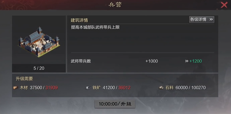 游戏的核心玩法围绕着资源管理、武将培养、同盟协作和战术部署展开。想要玩好这款游戏,关键在于平衡发展和战略规划,不能只顾着埋头种田或者一味打仗。资源是咱们发展的基础,木材、铁矿、石料和粮草这四种资源缺一不可。前期要优先占领周边低等级的空地,快速积累资源。五级地的产量是四级地的两倍,所以尽早打下五级地能大幅提升发展速度。记得合理使用政令,晚上睡觉前把政令保持在19个左右,这样醒来时刚好可以继续使用。主城升级要优先考虑,特别是七级城主府能解锁兵营,对后续发展帮助很大。