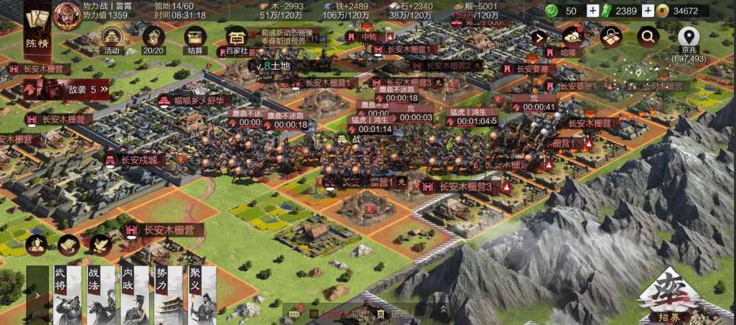 面对未知土地,可派遣低兵力骑兵队进行侦查,获取守军兵力与兵种信息,再决定是否主力出击。游戏内兵种存在克制链:骑兵克步兵、步兵克弓兵、弓兵克骑兵,合理利用克制关系能大幅降低战损。针对高级土地,可采用两队合击策略,即第一队拖平战斗后,5分钟内投入第二队完成收割。此策略要求两队兵力配比科学,例如5级地推荐主力5000兵力搭配副队3000兵力,确保连续作战能力。
