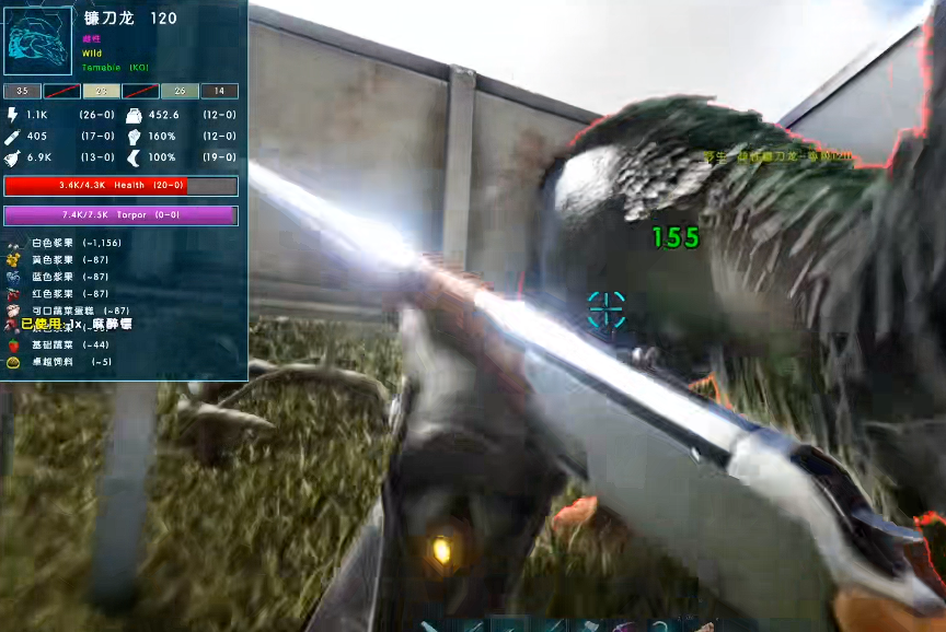 镰刀龙的眩晕值掉得特别快,所以咱们要提前准备大量黑色浆果或者麻醉药,时不时给它喂点,别让它中途醒过来。如果附近有水母,可以打点生物毒素,这玩意儿比黑色浆果更管用。驯服过程中最好清理一下周围,别让其他生物打扰,否则镰刀龙可能会被攻击或者逃跑。