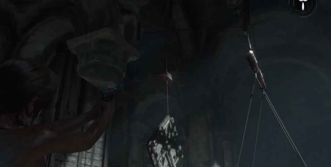 接下来的操作有一定时限,尽量不要耽搁。先用绳索箭矢将木筏和水车转轴再次相连,等木筏被拉近水车后,再用绳索箭矢将右上方拉环和水车转轴相连。然后赶快跳上木筏,等木筏移动到中央高台时跳上高台。沿着高台上的木板爬上高处,趁着木箱还没有降下去时利用它跳到对面遗迹入口。