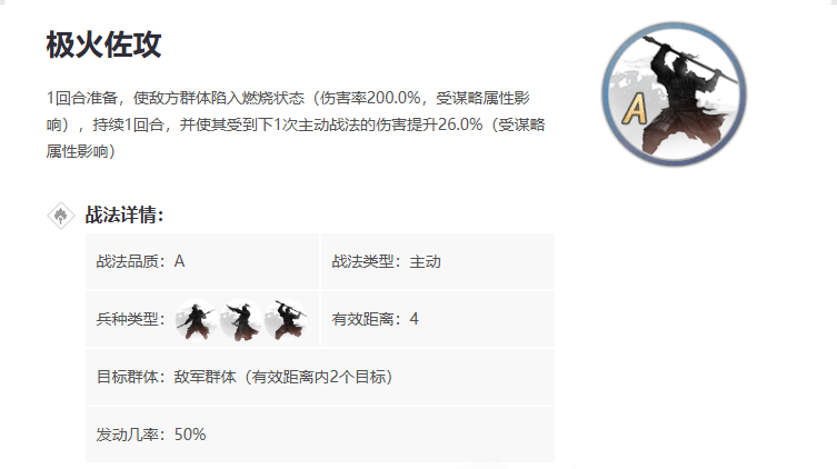 需要靠武将行动时随机触发,主打高爆发的伤害效果,同时能对敌方造成燃烧状态并提升后续主动战法的伤害。释放极火时需要把握好时机,建议在风声生效后再使用,因为风声能先削弱敌方的防御属性,让极火的输出更加致命。极火适合由攻击或谋略值突出的武将携带,例如周瑜或陆逊,这些角色的爆发力强,能充分利用极火的伤害加成。由于极火依赖发动概率,为了提高稳定性,可以给武将配备增加战法发动率的技能,比如始计或疾战,这样能增加极火的触发机会,从而在战场上快速压制对手。