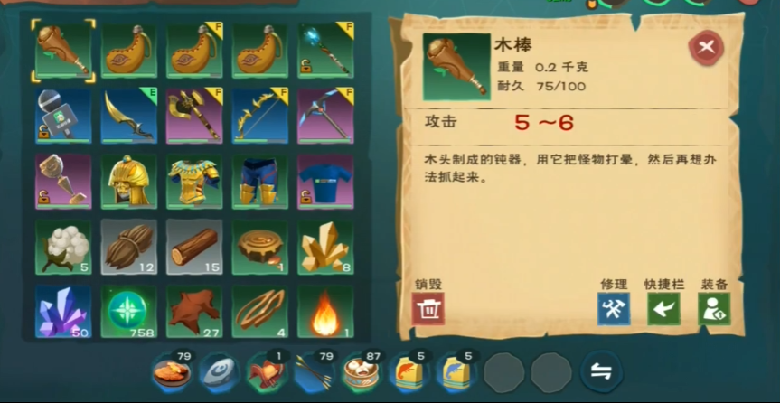 抓蜥蜴的标准工具是三件套:武器、木棒和捕捉器。武器是用来把蜥蜴的血量打到比较低的状态,方便后面敲晕,但是千万要掌握好分寸,可别下手太狠直接给打死了,那就前功尽弃了。等蜥蜴血量降到差不多四分之一的时候,就得赶紧换成木棒,因为只有木棒才有几率把目标敲晕,这是抓捕宠物专用的道具。最后一个关键道具是捕捉器,这东西需要用石块和牛筋在工作台制作,牛筋可以通过打牛获得。把这些工具都放在快捷栏里,到时候切换起来才方便。