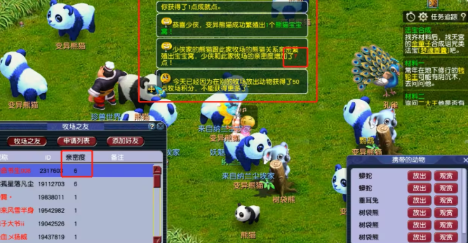 亲密度可是一个隐藏但非常重要的系统。它影响着你拜访繁殖时,对方牧场也有几率获得宝宝窝的概率。亲密度提升比较慢,比如连续五天拜访同一个牧场,亲密度才增加1点;而如果连续3天不去拜访,亲密度则会下降10点,可以说是上升难、下降易。找几个固定的、能长期互相拜访繁殖的小伙伴是非常重要的。高亲密度不仅能提高双方获得宝宝窝的几率,还能有效降低你自己牧场动物断窝(即没有新宝宝窝接续)的风险,让牧场运作进入良性循环。