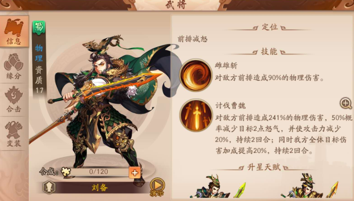 游戏中的四大阵营各具鲜明的战术风格,玩家应根据自身拥有的武将资源和偏好来选择发展路线。魏国阵容擅长控制和爆发,通常围绕曹操的减伤、郭嘉的控怒以及荀彧的增益效果来构建体系,通过打断敌方技能节奏并制造高额伤害来取得优势。蜀国阵容则侧重于高爆发与持续输出,以关羽、张飞、赵云等武将为核心,利用其强大的单体与群体伤害能力,追求在短时间内击溃对手,部分蜀国武将还具备回怒特性,能够加快技能循环。吴国阵容的核心战术是灼烧效果,依靠周瑜、陆逊等武将施加的持续群体伤害来消耗对手,配合孙坚等前排的稳定承伤和大乔的治疗,适合进行持久作战。群雄阵容多以吕布为核心,搭配貂蝉形成合击,追求极致的单体爆发能力,但往往对资源投入和武将养成度要求较高。