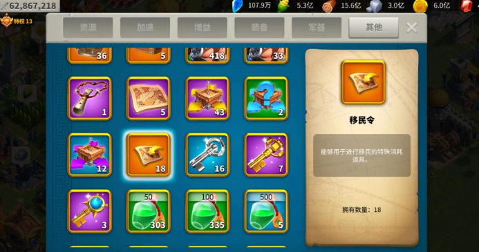 移民所需的道具是移民令,其消耗数量并非固定,而是根据你在目标王国当前个人战力排行榜上的预估排名来决定的,战力排名越高意味着你需要准备的移民令越多。压战力可以直接影响到移民的票价。移民令可以通过联盟商店使用联盟积分兑换,或者从一些游戏活动中获取。在进行移民操作前,建议提前在移民界面查看目标王国的战力排行榜,估算自己需要准备的数量。成功移民后,会有30天的冷却时间才能再次进行迁移。