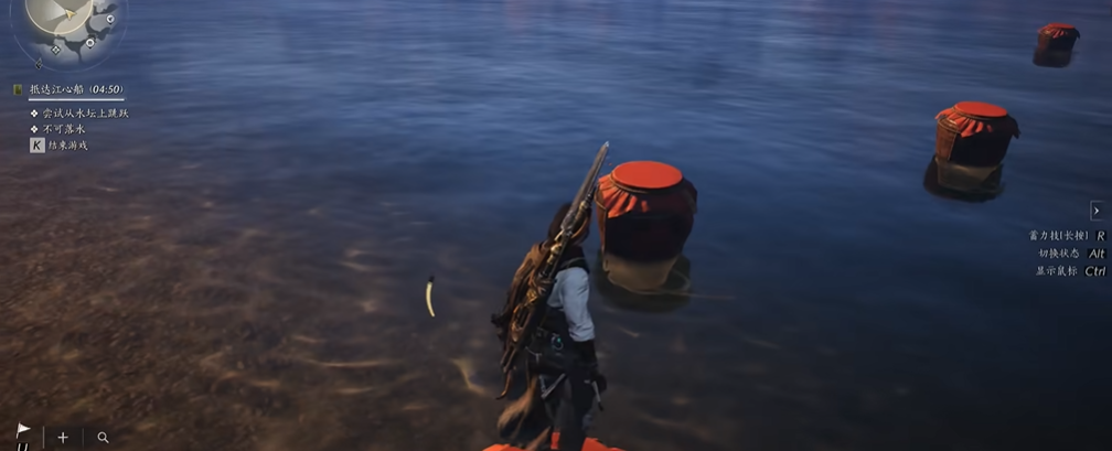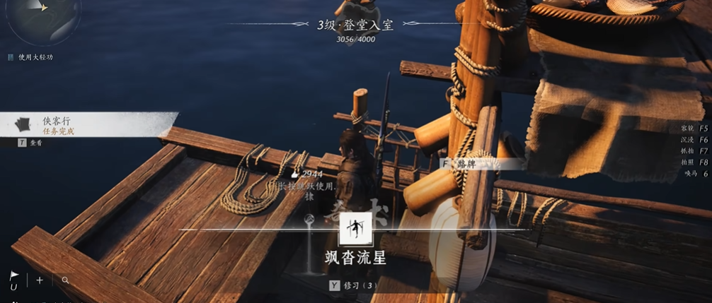 与渔翁对话触发任务后,你需要完成他设置的一个小挑战。这个挑战通常被描述为跳酒坛游戏,湖面上会升起一列酒坛。你需要利用冲刺等操作,精准地踩着这些酒坛到达湖中远处的船上,中途落水则可能挑战失败。成功抵达船上后,找到并拾取船上的秘籍,即可完成仇越海任务。任务奖励就是大轻功奇术·飒沓流星,它会直接加入到你的技能列表中。这是游戏前期就能获得的重要赶路技能,能让你在广阔地图中的移动效率大幅提升。