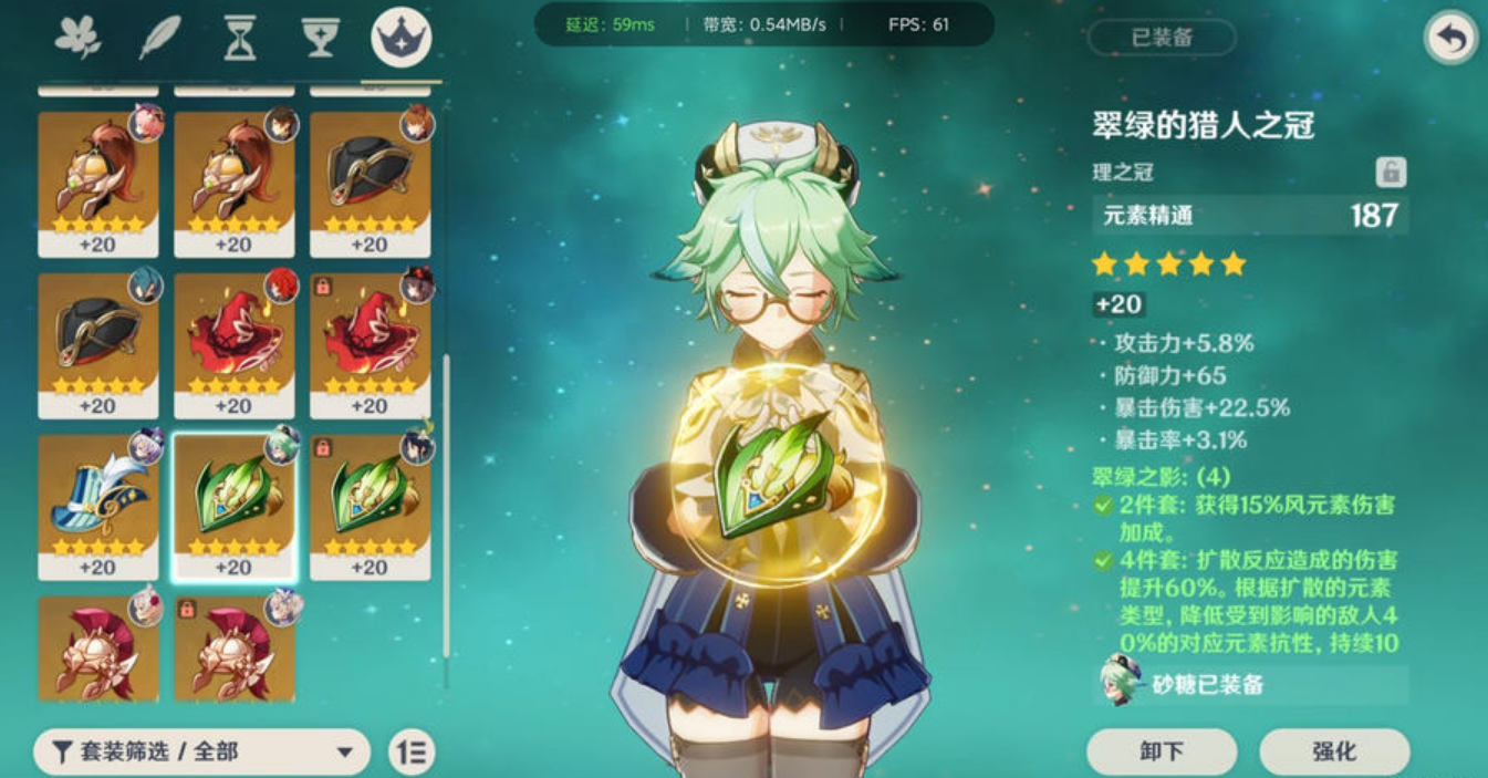 砂糖作为风系辅助角色,前期圣遗物搭配的核心思路是优先堆叠元素精通和充能效率。花和羽毛的主属性固定为生命值和攻击力,所以重点要放在沙漏、杯子和头冠的选择上。沙漏推荐元素精通或充能效率,杯子选元素精通,头冠也优先元素精通。这样搭配能让你的砂糖在前期快速成型,为队伍提供稳定的元素反应增益和聚怪效果。