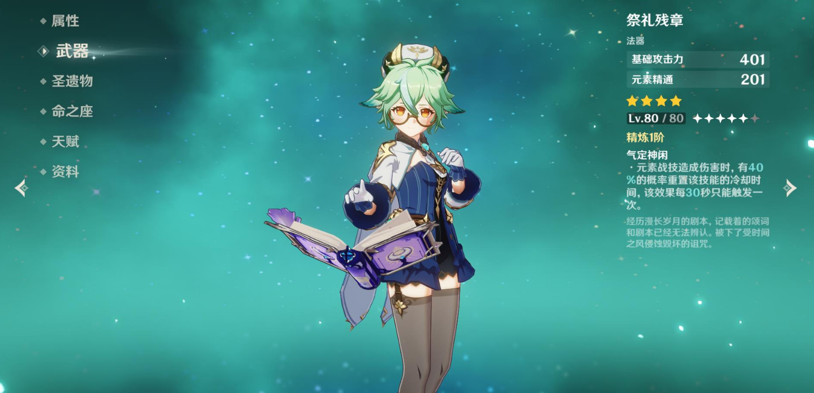 武器方面,三星的魔导绪论或翡玉法球是不错的选择,副属性都能提供元素精通。四星武器推荐祭礼残章,它的高额精通加成和重置战技冷却的效果能让砂糖更频繁地触发扩散反应。如果没有祭礼残章,也可以用西风秘典或万国诸海图谱替代,前者能缓解充能压力,后者则能提升元素反应伤害。
