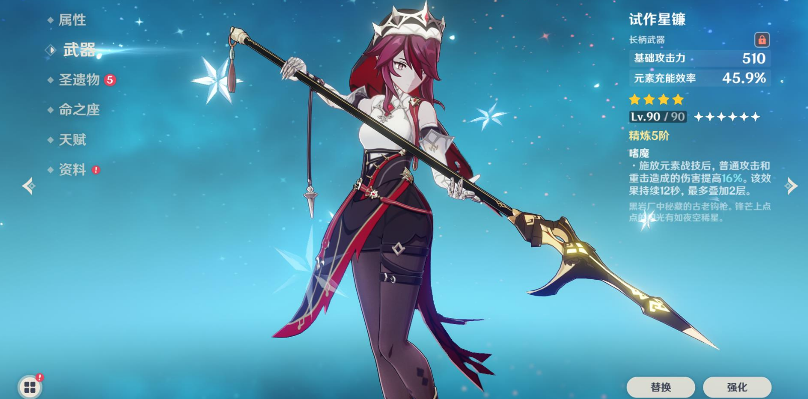 罗莎莉亚作为冰系长枪角色,既能当物理主C也能做暴击辅助,不同定位的武器搭配可是完全不同的。咱们先来划重点:五星首选和璞鸢或护摩之杖,四星优先决斗之枪或西风长枪,三星过渡可用白缨枪。如果你走的是物理输出路线,重点要堆高攻击力和暴击伤害。