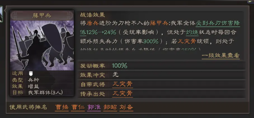 八门金锁这个战法就很典型,它能两回合封住敌方的普通攻击,在前期特别好用。如果你的阵容里已经有足够的前排武将,那么拆掉曹仁获取这个战法是很划算的选择。类似的还有反