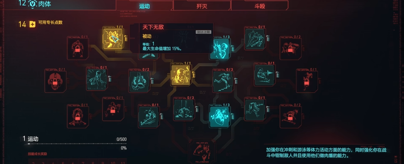 肉体系列加点应优先考虑驼兽和天下无敌技能,前者提升60点负重能力,后者增加10%体力上限(满级可达30%)。智力属性推荐点出进阶数据探勘和见光,前者显著提升黑客连接点获取的金钱收益(满级增加100%),后者能暴露试图入侵的敌方黑客位置。技术能力中的作废技能可自动拆解废料为素材,大幅提升资源收集效率。这些技能组合能有效解决初期资源匮乏问题。