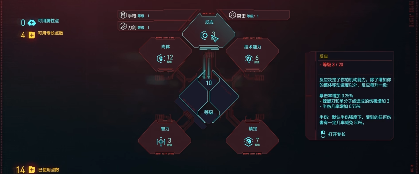 反应属性主要影响暴击率和武器效能,初期3点投入可解锁基础战斗能力。镇定属性则提升暴击伤害和潜行效果,3点投入已能满足非专精流派需求。需注意部分武器如狙击枪、机枪对体能属性有硬性要求,低体能角色将无法使用这类重型装备。同时技术能力不足会导致义体安装受限,建议至少保持5点基础值。