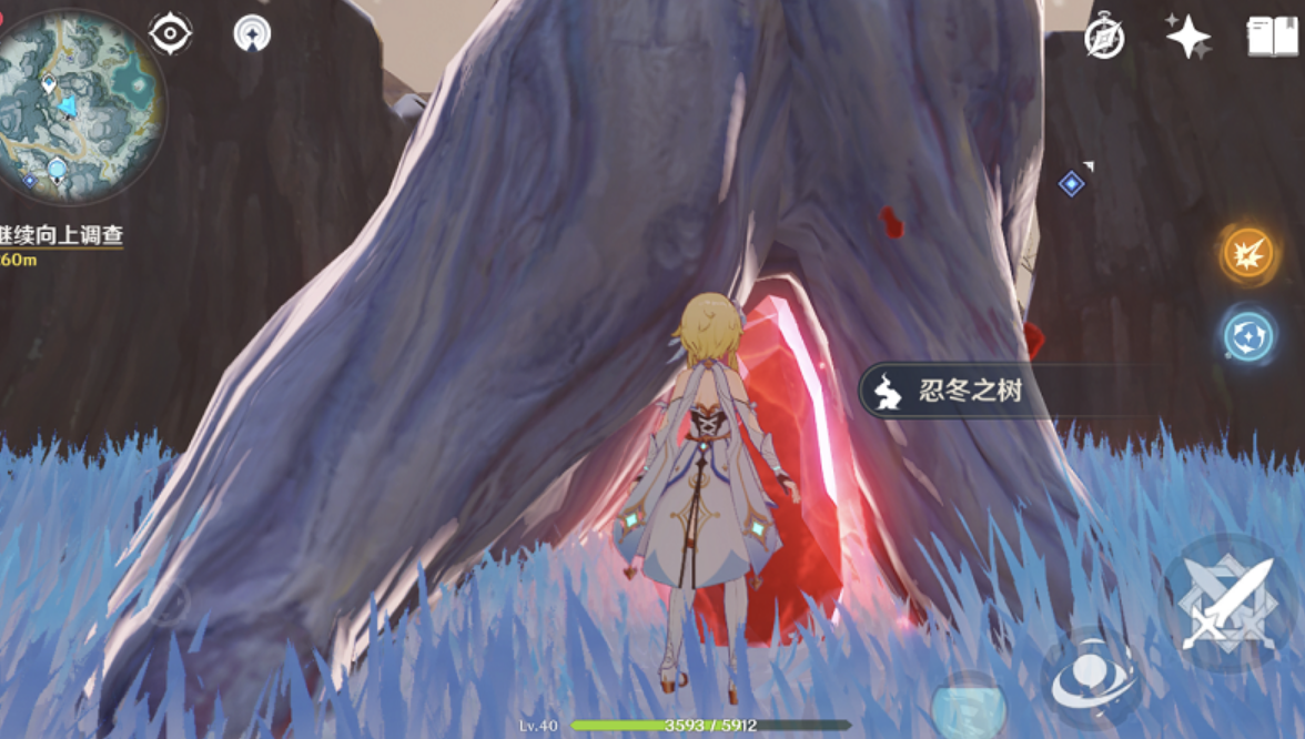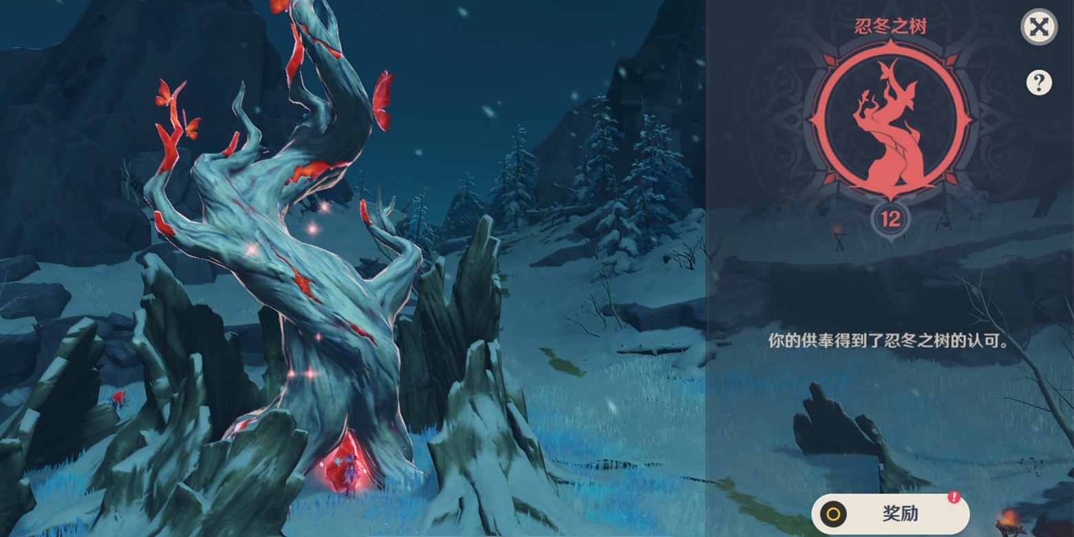 解锁雪山大树的关键在于找到忍冬之树并收集绯红玉髓进行供奉。忍冬之树位于龙脊雪山区域的覆雪之路传送点附近,外观带有红色枝干,在雪山环境中较为显眼。解锁前需要击碎周围的深赤之石获取buff,对包裹忍冬之树的冰晶进行多次攻击才能解封。深赤之石分布在树周围,每次击碎后需重新寻找新的深赤之石重复操作。