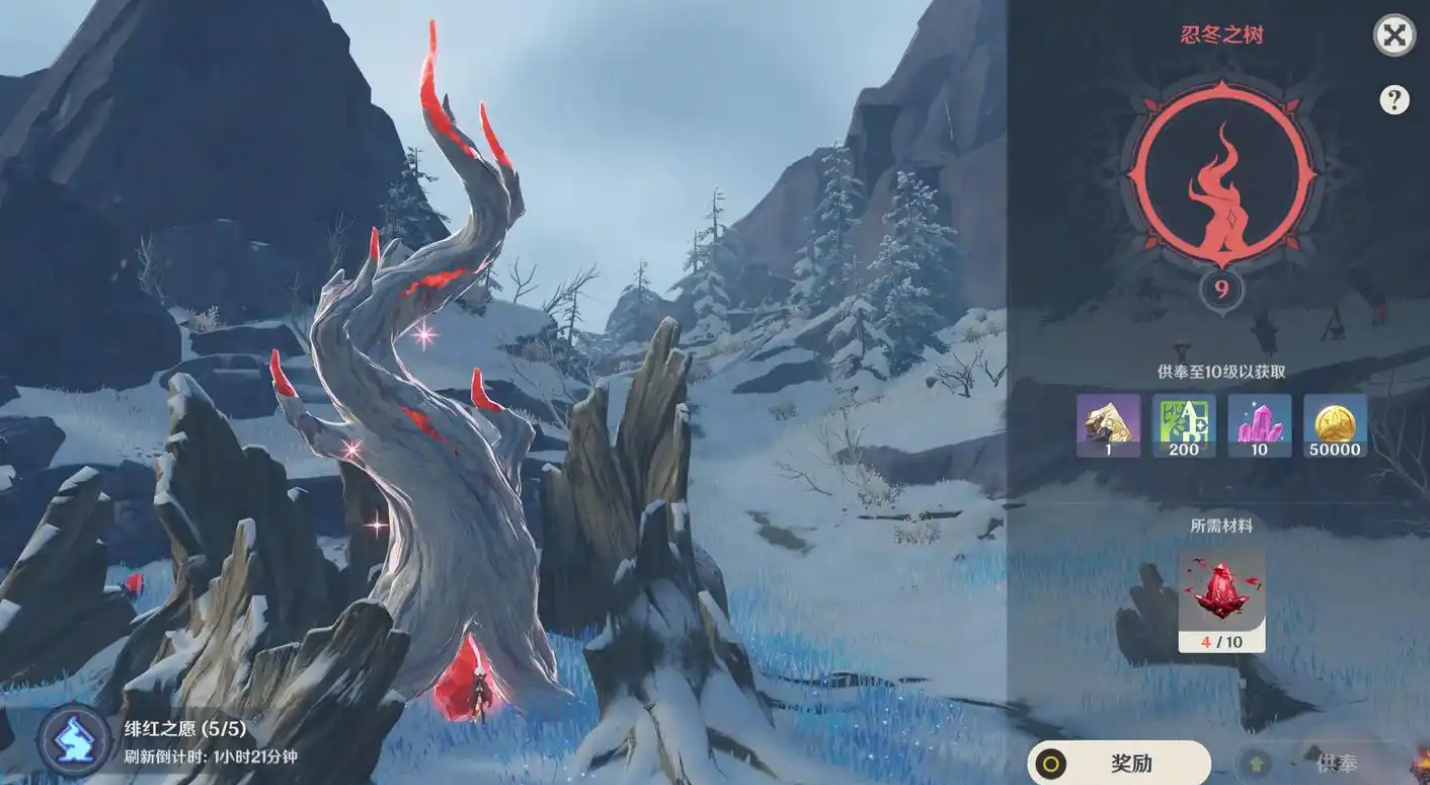 忍冬之树解封后,玩家需要通过探索雪山收集绯红玉髓进行供奉升级。绯红玉髓是雪山地区的特殊收集物,分布在各个角落,包括隐藏的雪堆、解谜机关后以及击败特定敌人后掉落。供奉忍冬之树至4级可获得放热瓶图纸,这个道具能在雪山探索中提供移动热源,有效降低严寒值的积累速度,对后续深入雪山区域至关重要。