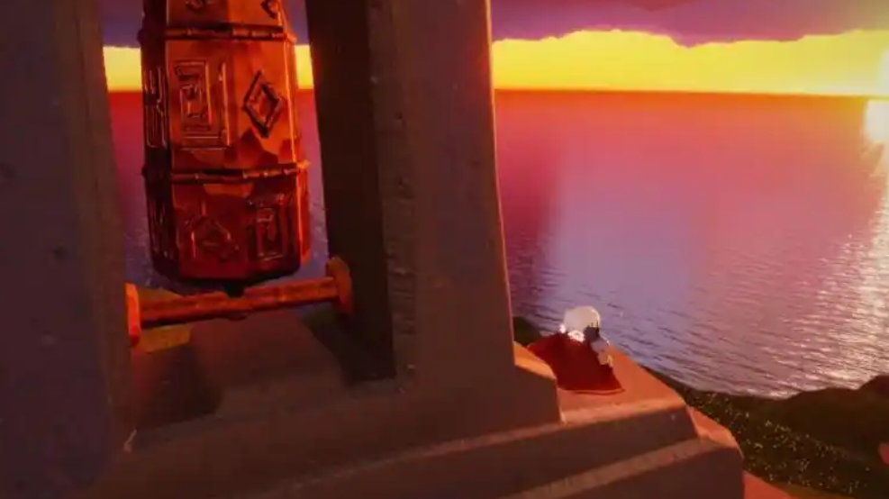 进入神殿内部后,咱们会发现空间比想象中开阔。正中央有一座巨大的钟塔,周围环绕着浮空的石板和光柱。靠近钟塔时,游戏会自动触发动画,咱们的角色会做出祈福动作,这时候画面效果非常震撼。完成互动后,神殿侧门会开启,里面藏着一些隐藏的光之翼和烛火,别忘了顺手收集。