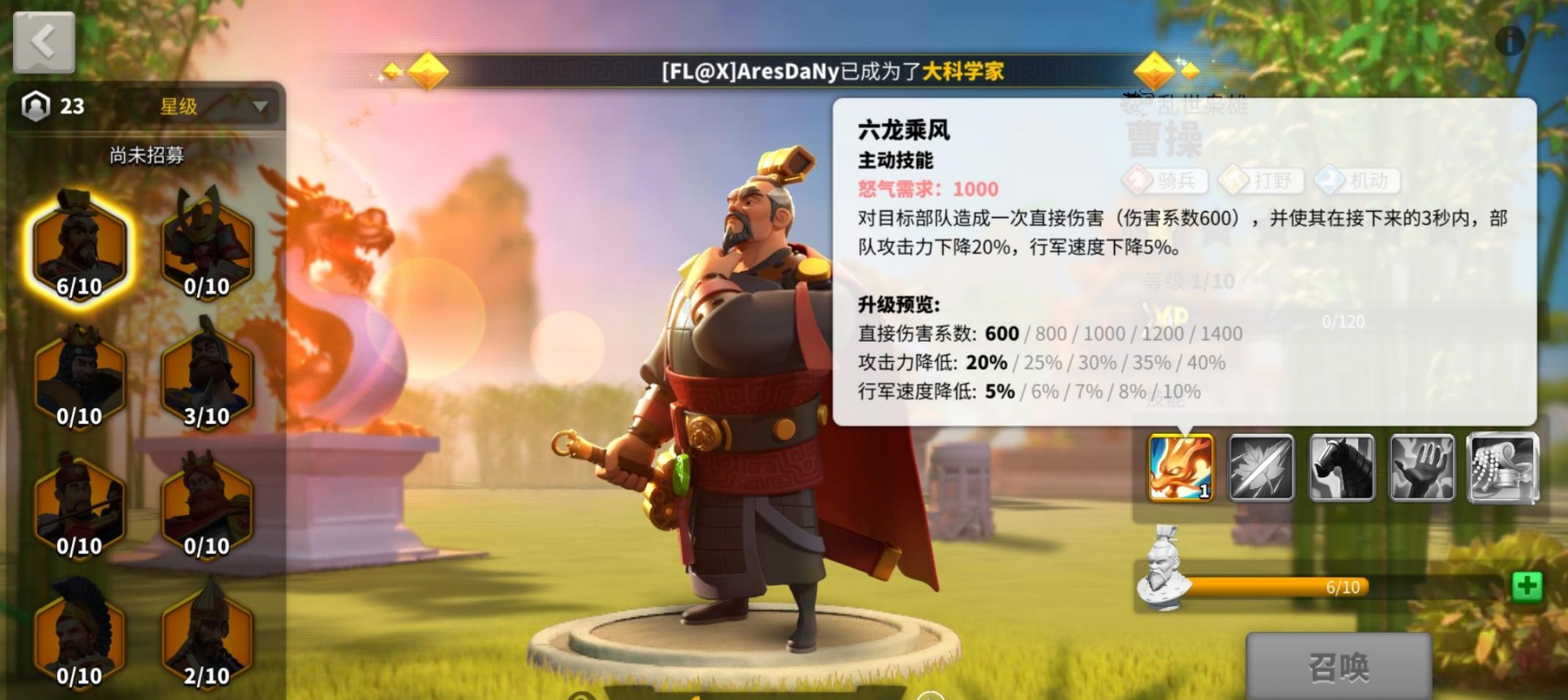曹操的技能组合决定了他在战场上的多功能性。主动技能六龙乘风能造成单体高额伤害并附加减益效果,被动技能则强化对野蛮人伤害和骑兵属性。觉醒后的曹操进一步提升了团队增益能力,但需注意其技能触发存在概率机制。建议优先升级1、3、4技能,2技能可暂缓提升,这种加点顺序能最大化曹操的实战价值。