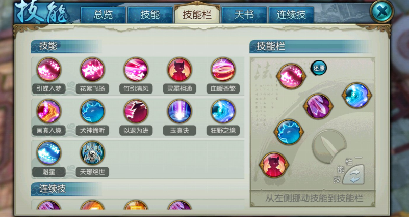 灵契作为诛仙手游中独特的召唤系职业,技能摆放直接影响战斗流畅度。核心思路是将通用技能置顶,输出技能组合放置,召唤类技能单独摆放。第一页置顶技能选择引蝶入梦,这个针对加血职业的通用技能需要快速释放。紧接着摆放玉真诀+天琊的连续技组合,这两个输出技能冷却时间相近,放在一起操作更顺手。召唤灵兽技能建议单独放置,方便随时召唤犬神谛听或孔雀明王助战,灵犀相通放在召唤技能下方,这样连招时手感更自然。