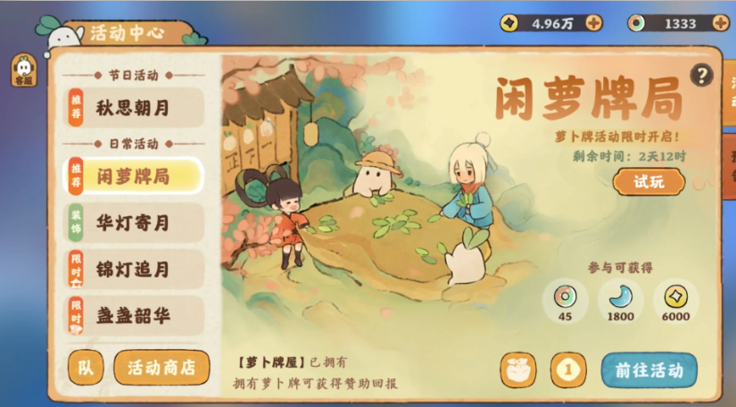 叶子牌是桃源深处有人家里一个特别有趣的玩法,咱们可以通过打牌赢取铜币奖励,还能和其他小伙伴一起互动。这个玩法需要先抽满300次创物抽奖才能解锁牌桌,之后就能去别