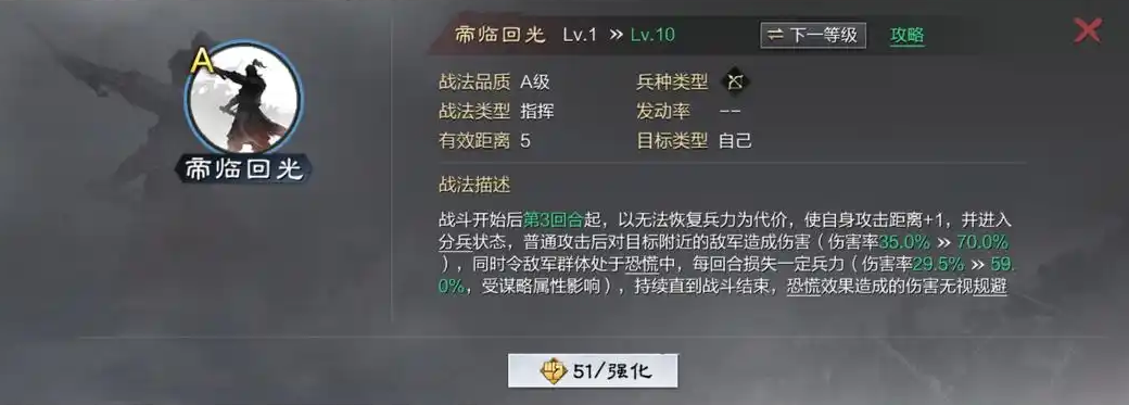 灵帝的自带战法帝临回光在准备回合就已生效,即使前三回合阵亡也能持续造成恐慌伤害,但第三回合后无法恢复兵力是硬伤。因此尽量避免与恢复型武将组队,优先选择减伤或控制型队友。分兵状态虽然伤害率不错,但依赖存活条件,目前主流更倾向谋略路线。白板灵帝的速度属性较高,可调整加点抢先手,配合神兵、大赏的增益期打出爆发。面对高恢复队伍时,灵帝的持续伤害能有效克制,但需避开高反击武将。
