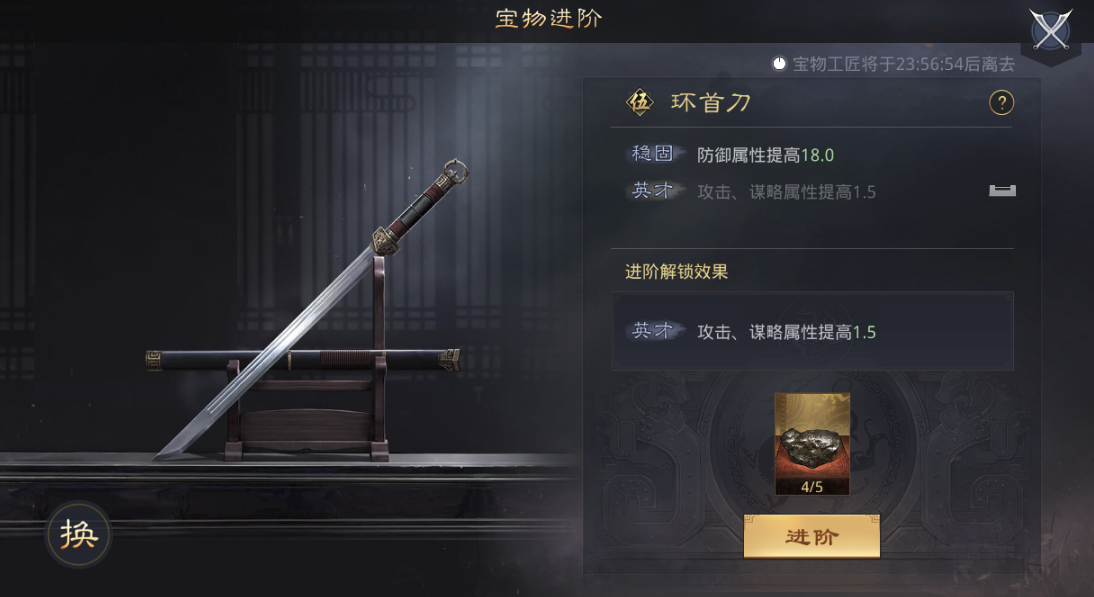 首先得把精品宝物强化到5级,这时候就能找工匠进行第一次进阶了。进阶后会变成罕俦品质,同时解锁新的基础效果,但强化等级会重置为0级。记得不同类型的宝物需要的材料不一样,铁质武器需要赤珠山铁,木制武器则需要小叶紫檀,混合材质两者都要。进阶后宝物的名字和外形也会变得更酷炫哦。