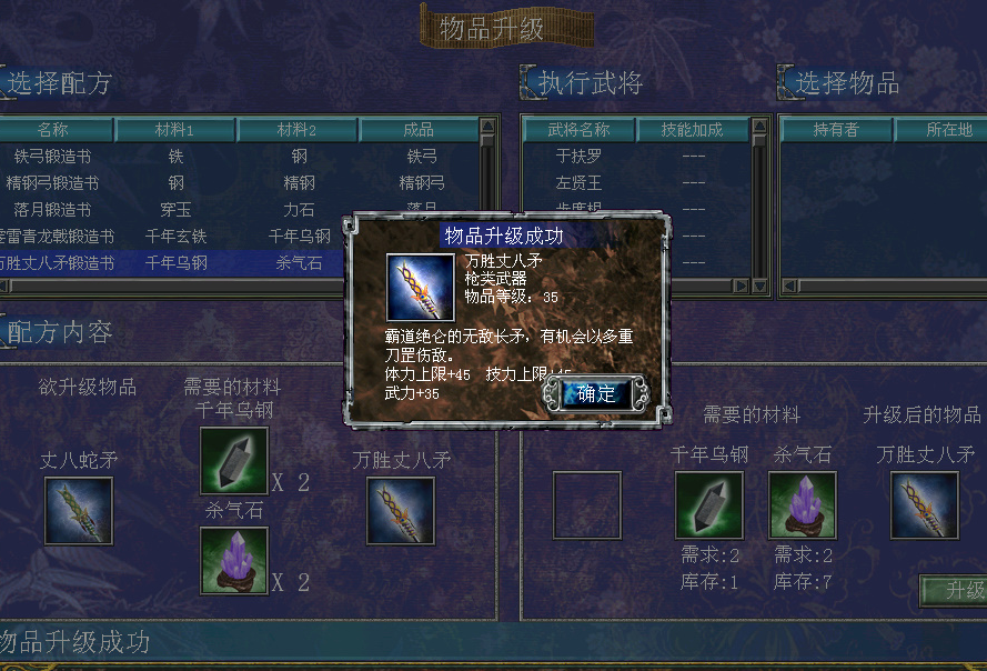 装备搭配方面,顶级组合为万胜丈八矛、黑麒麟坐骑和九天玄铁道具。万胜丈八矛提供高额攻击加成,黑麒麟增加移动速度和闪避率,九天玄铁则具备体力回复特性。替代方案可选择血刃配合玄铁的组合,在吸血效果支持下实现持续作战。坐骑方面白玉麒麟的凝神特性可提升命中率,与骁勇特性形成互补。