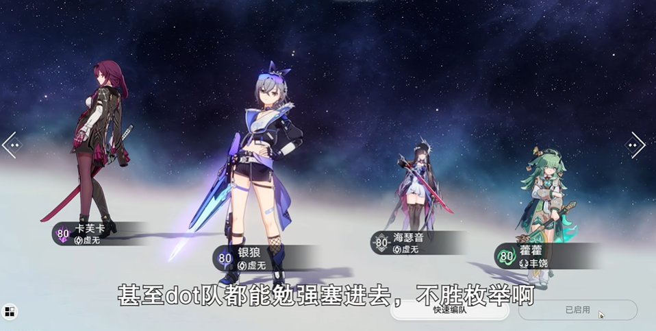 阵容搭配存在两种主流思路:量子纯色队与双色混编队。前者以希儿/青雀为主C,配合银狼+符玄/玲可组成量子战舰,能稳定植入量子弱点;后者则通过控制队伍属性种类(建议不超过两种)来提高银狼植入主C弱点的概率。银狼与布洛妮娅的配合需要注意速度轴调节,保证主C能在银狼上完弱点与减防后立即行动。生存位选择罗刹时可组成泛用性极强的双色队,应对非量子弱点敌人表现突出。