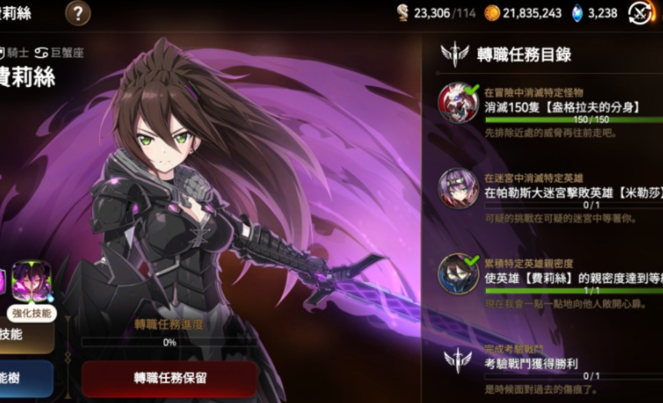 完成转职后需重新评估费莉丝的装备和技能搭配。防御属性和效果抗性是其核心培养方向,建议优先强化防御类装备。转职后技能识破砍击可提升团队速攻值,在竞技场中能抢占先机。若资源有限,可暂缓其他角色转职,优先集中培养费莉丝以快速形成战力。