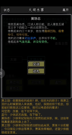 在太湖水寨会遇到萧之羽,和他聊完天会出现司空茂、孟竹和莫协志,这时候需要和他们切磋一下,打赢后回去找萧之羽再打一场就能拿到潜能和阅历。支线方面,幽暗小巷的王道士身上有玉坠,打败他后把玉坠送给裁缝店的孙大娘,能换到不少潜能。