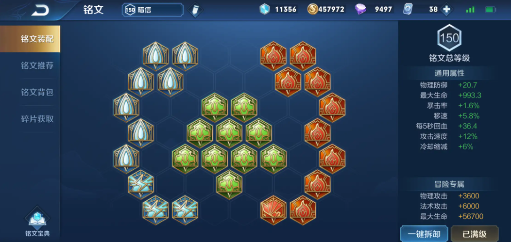铭文搭配上,主流推荐是十个夺萃、十个鹰眼,红色铭文带九个红月和一个祸源。十个夺萃提供了16%的物理吸血,让暗信在前中期就有很强的续航能力,可以长时间赖线或反野而不用频繁回家。十个鹰眼提供物理穿透,增强前期伤害。红月提供攻速和少量暴击,正好卡住暗信的攻速阈值,让普攻手感更流畅。这套铭文追求的就是极致的对拼和续航能力,强调不能怂,就是干的风格,因为暗信一技能有霸体和加速,对拼不过时也能轻松撤退。