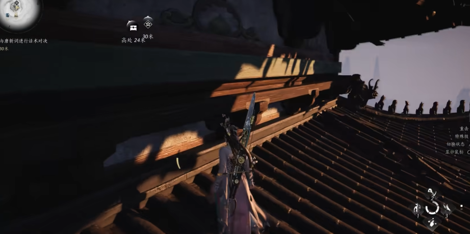 若无大轻功,则需依靠钟楼外围的脚手架和破损楼梯进行攀爬。这是一条为新手设计的固定路线,全程无需与敌人强制战斗。从钟楼外部右侧的脚手架开始,逐层向上,利用可见的木板和阶梯结构。途中需要注意观察并调查楼体上的战斗痕迹等线索,这些线索本身可能也是独立探索目标的一部分。攀爬时需谨慎操作,以防坠落导致重新开始。