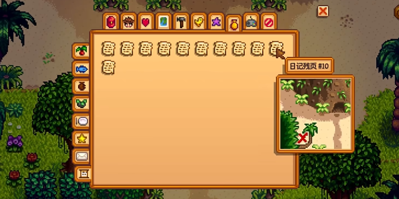 除了提供背景故事,部分特定的日记残页直接关联着游戏内重要的隐藏宝藏,这是其最具实用价值的方面。第4页、第6页和第10页这三张残页各自明确记录了一个藏宝地点,分别指向贝啼小屋北边、岛屿农场区域以及火山入口外的特定土堆。玩家只有在获取并阅读了对应的残页后,前往这些指定地点使用锄头挖掘,才能成功获得金核桃、鸵鸟蛋或珍珠等珍贵奖励;若未先获得残页,即使找到正确位置也无法挖出任何物品。