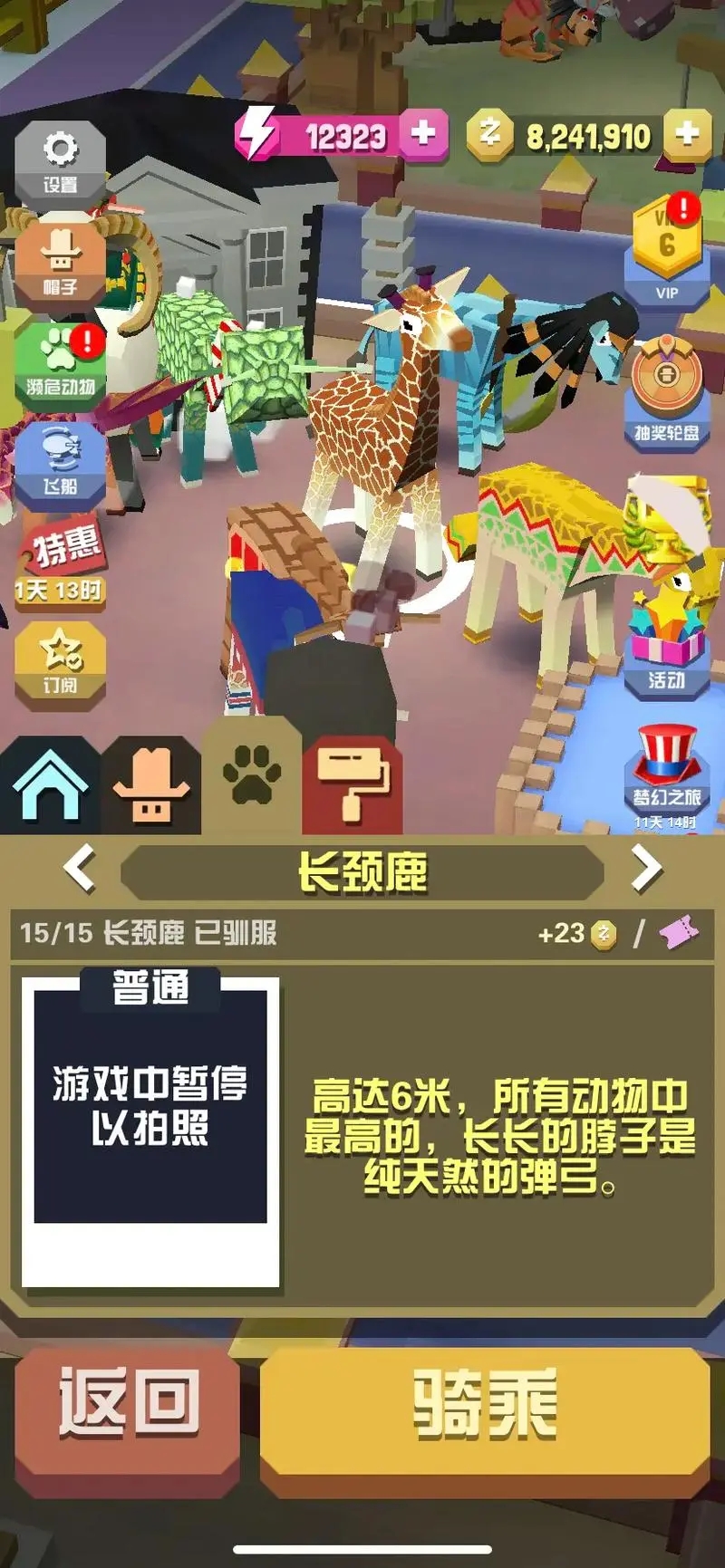 提升获取成功率的关键在于优化野牛骑乘体验,可提前升级野牛栖息地,延长野牛的可骑乘时长,降低狂暴触发概率,同时提升野牛的冲撞容错率,减少因碰撞翻车的情况。奔跑过程中尽量避开大象、长颈鹿等大型动物,防止被阻挡路线或撞击失控,遇到密集动物群时,借助野牛的短暂无敌冲刺效果强行通过,维持奔跑节奏,确保距离计数持续累积,不出现中断重置的情况。