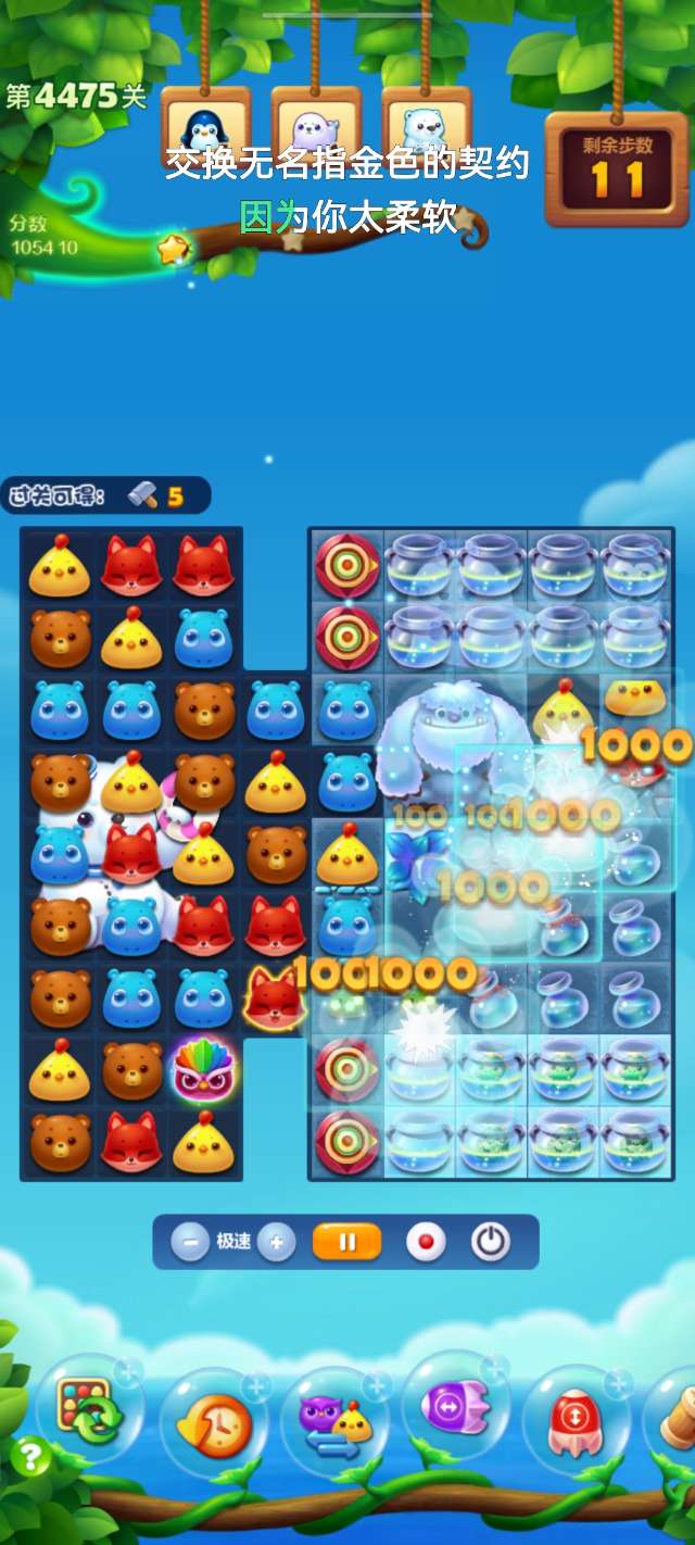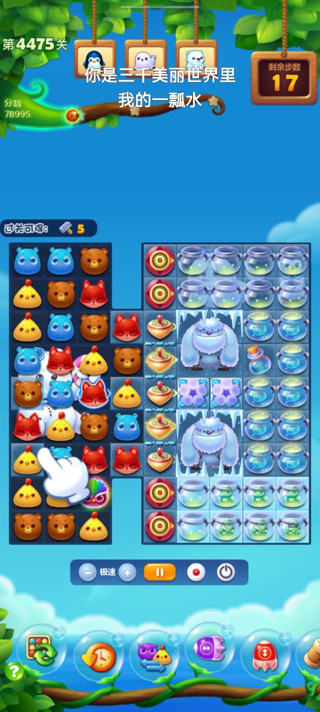 消除过程中要时刻关注金豆荚的位置与出口状态,若左右移动地板出口堵塞,优先清理附近小动物,若右下角出口金豆荚堆积,用特效快速清理,防止卡壳。不要随意使用道具,将小木锤、刷新道具留到关键时机,比如金豆荚被单个障碍困住、或全局无有效消除时使用,最大化道具收益。保持节奏稳定,每一步都精准瞄准目标,利用特效与道具的配合,让金豆荚持续掉落,在步数耗尽前完成23个金豆荚的收集。
