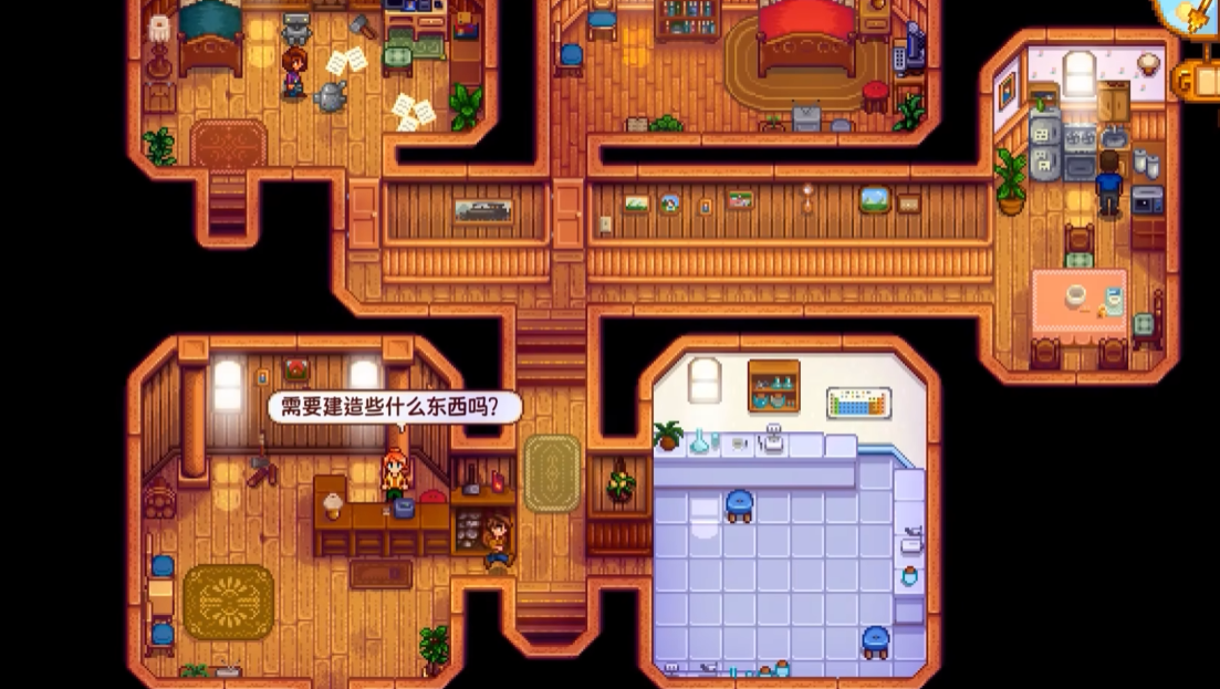 与罗宾互动可解锁农场建筑系统,包括基础畜棚、鸡舍的建造,以及农舍的三阶段升级服务。每次建造需支付金币并提交特定资源,如木材、石头等材料。二级农舍升级后会解锁厨房功能,最终阶段则附带地窖空间用于物品陈酿。部分特殊建筑如马厩、温室需要通过完成社区中心收集包或Joja仓库任务才能解锁建造权限。