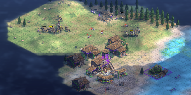 中间发展的时候别忘了探索地图,橙色盟友海门会找你要6个农民,给他们之后能换到一大波猎狼和爆破手支援,这笔交易绝对划算。青色敌人那边投石车威胁很大,操作不熟练的话先别去招惹。西边的绿色哥特人伐木场没啥防守,可以轻松拆掉拿到900木材资源,这对前期发展帮助很大。