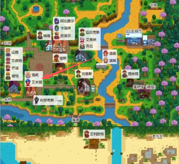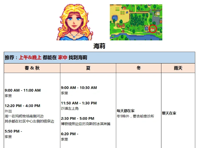 海莉平时最爱去的地方就是家里厨房、河边的牧场、社区中心的喷泉以及自己的房间。这姑娘是个典型的宅女加文艺青年,白天喜欢出门拍照,晚上准点回家睡觉,生活规律得很。她住在鹈鹕镇柳叶巷2号,和姐姐艾米丽一起生活,那栋蓝色房子就在镇子中央广场左下方,特别好认。想找她的话,记得她家旁边就是乔迪住的柳巷1号,两姐妹的房子挨得很近。