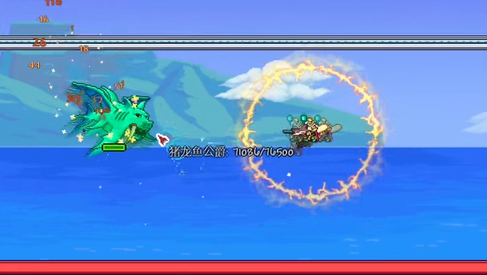 猪鲨公爵的战斗分为多个鲜明阶段,掌握其攻击规律是取胜的关键。第一阶段,猪鲨拥有60000点生命值,其攻击循环通常以五次高速冲撞开始,每次冲撞能造成约100点伤害,随后会切换为释放爆炸泡泡或召唤鲨鱼龙卷风。爆炸泡泡可以被玩家的远程攻击击破,而鲨鱼龙卷风则会持续发射出可以击杀的小型鲨鱼龙。当猪鲨的生命值降至50%以下时进入第二阶段,它的移动速度会显著提升,冲撞次数减少为三次,爆炸泡泡的移动轨迹变得更加复杂,呈圆形散布,同时鲨鱼龙卷风会升级为伤害更高的克苏鲁旋风。在专家模式下,当生命值低于15%则进入艰难的第三阶段,猪鲨会进入隐身状态并频繁瞬移到玩家身后,仅使用冲刺攻击,其冲刺模式会在一、二、三次之间循环,同时屏幕环境会变暗增加难度。