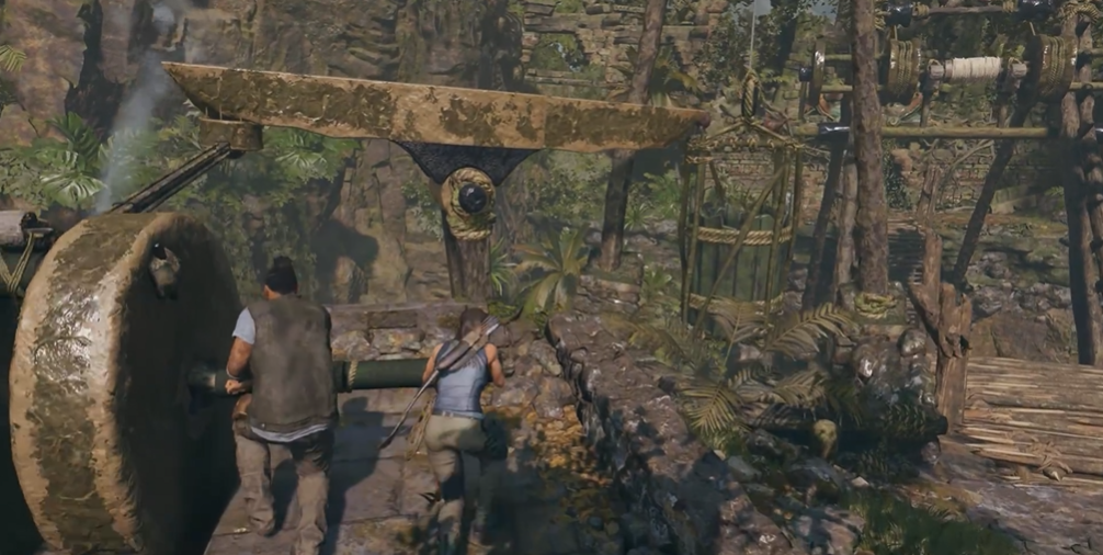 要将水流引导至特定的容器中以平衡机关。在吊桥的左侧存在另一个需要操作的机关,这里通常需要劳拉与同伴乔纳进行合作。两人共同推动这个机关,使之前释放的水流改变方向,导入一个绿色的容器之中。这个绿色容器承担着平衡与配重的功能,是拉起吊桥的关键一环。
